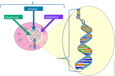 Aging, chemicals, lifestyle, environment and radiation act by: damaging genes