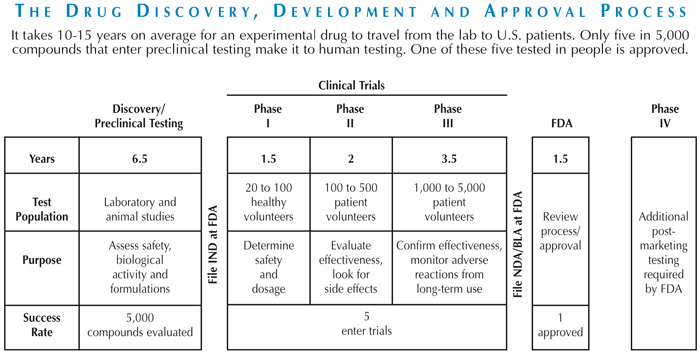 Length of time from early research to drug approval can be up to 20 years on