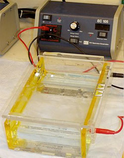 Southern blot techniques are used to analyze DNA and Northern blot techniques to analyze RNA. In both cases, the nucleic acid is separated by gel electrophoresis, a process that separating molecules on the basis of their size using an electric current applied to a gel matrix.