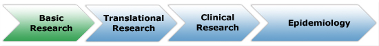 Going back to our arrow image, you can see we have been discussing what's on the far left, which is the beginning of the process. When you hear the term "bench to bedside" the "bench" part of the research refers to basic research, because this work takes place in a lab at a "bench".