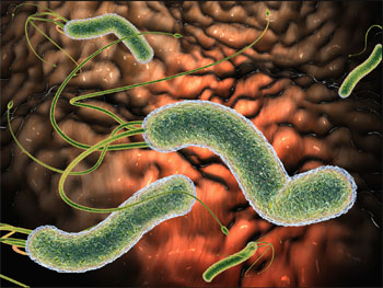 Helicobacter pylori bacillus attacking the gastric mucosa. |