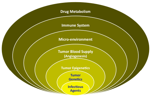 Infectious agents, and cancer stem cells are now being studied. Further, factors beyond cancer cell genetics (i.e., epigenetics) and beyond the cancer itself (e.g., the blood supply, micro-environment, the immune system and drug metabolism) are key to understanding and effectively treating cancer.